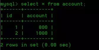 我们将 id=1 的用户 account 减 200。然后查询,发现 id=1 的用户 account 变为 800。